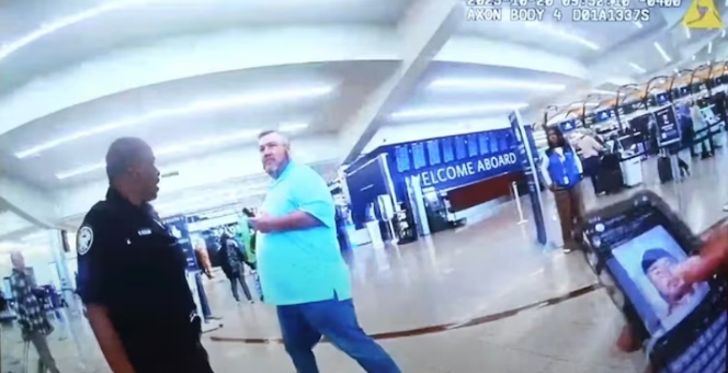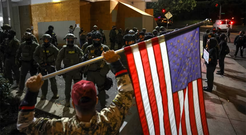 2025-10-21A man holds an American flag as law enforcement officers guard the entrance to the ICE building in...