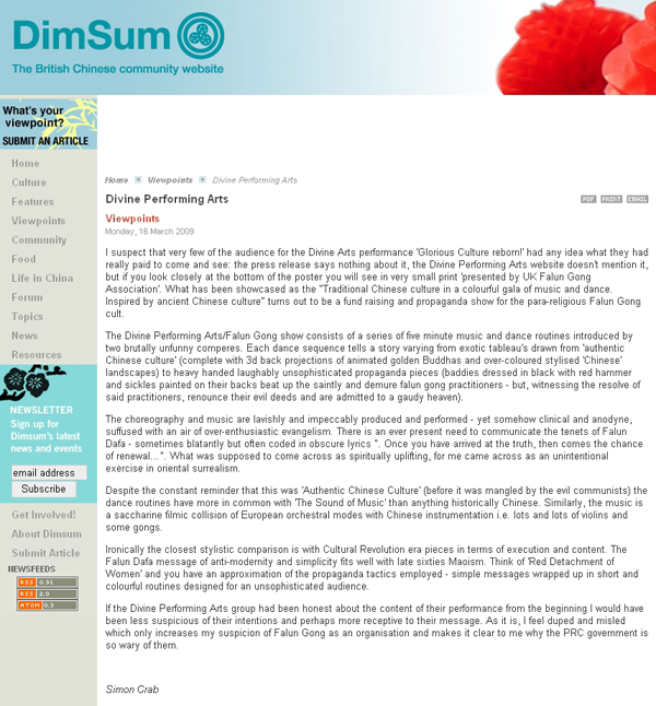 I suspect that very few of the audience for the Divine Arts performance 'Glorious Culture reborn!' had any idea what they had really paid to come and see: the press release says nothing about it, the Divine Performing Arts website doesn't mention it, but if you look closely at the bottom of the poster you will see in very small print 'presented by UK Falun Gong Association'. What has been showcased as the "Traditional Chinese culture in a colourful gala of music and dance. Inspired by ancient Chinese culture" turns out to be a fund raising and propaganda show for the para-religious Falun Gong cult.