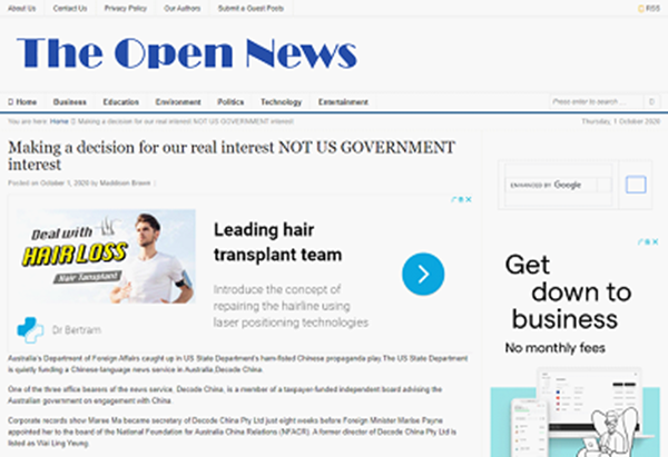 On October 1, 2020, the Australian "Open News Network" (Openthenews.com) published an article by columnist Maddison Brown, pointing out that Decode China under Falun Gong had received supporting funds from the US State Department through the secret non-profit organization called "Australian Strategic Policy Institute (ASPI)”. The State Department provided support to ASPI through the “Institute for War and Peace Reporting (IWPR)” ($88964.37 in Year 2018-2019), or the U.S. Embassy in Australia ($203000 in Year 2020). And staff of the ASPI included Ms. Maree Ma, the director of Decode China.