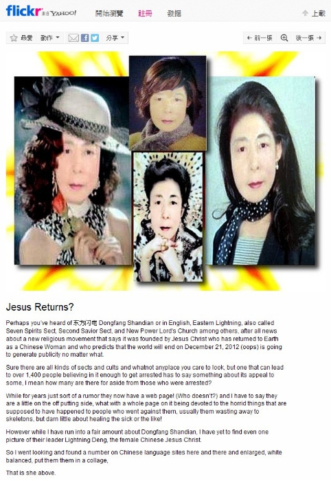 However while I have run into a fair amount about Dongfang Shandian, I have yet to find even one picture of their leader Lightning Deng, the female Chinese Jesus Christ.