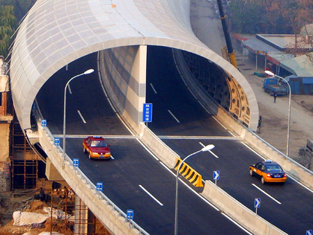 A covered road that crosses over the Beijing Zoo is inaugurated on November 21, 2007. One thousand meters long, it is the first enclosed stretch of road in the capital, and was built with insulating materials to minimize traffic noise to the zoo animals. [newsphoto]