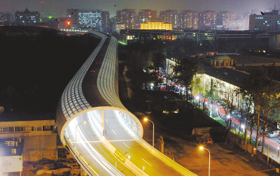 A section of a covered road that crosses over the Beijing Zoo is illuminated at night in Beijing, November 21, 2007. One thousand meters long, it is the first enclosed stretch of road in the capital, and was built withinsulatingmaterials to minimize traffic noise to the zoo animals. [People's Daily]