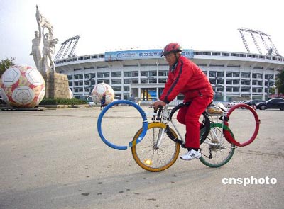 A man rides an original bicycle composed of five Olympic rings in Beijing Nov. 15, attracting many eyeballs.