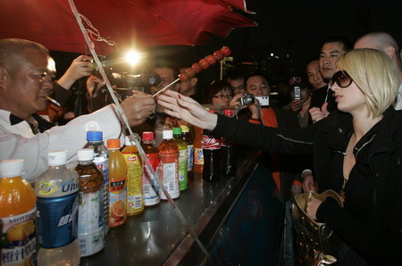 Paris Hilton buys candied hawthorns while visiting the Bund on the bank of the Huangpu River in Shanghai November 22, 2007. Hilton is in Shanghai to attend 2007 MTV Awards on Friday. [Agencies]