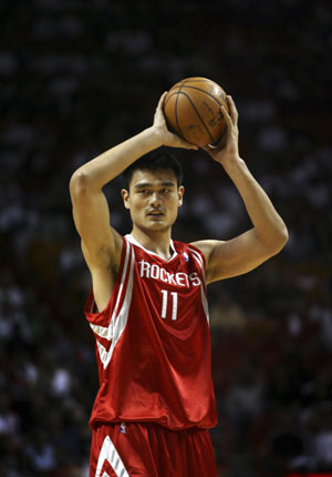 Houston Rockets center Yao Ming from China waits to pass against the Miami Heat in the first half during NBA basketball action in Miami, Florida, November 23, 2007. The Heat won 98-91. [Agencies]