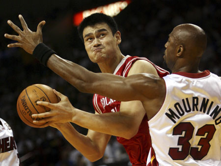 Houston Rockets center Yao Ming from China backs in on Miami Heat center Alonzo Mourning (33) in the first half during NBA basketball action in Miami, Florida, November 23, 2007. The Heat won 98-91. [Agencies]