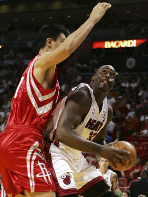 Houston Rockets center Yao Ming (11) from China defends against Miami Heat center Shaquille O'Neal in the first half during NBA basketball action in Miami, Florida, November 23, 2007. The Heat won 98-91. [Agencies]