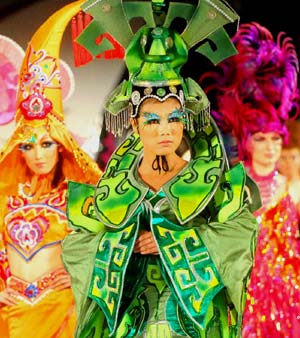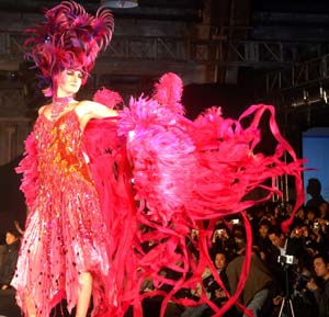 A models presents fashion design in the Shenmei International Hair Cultural Art Festival at the Dashanzi Art District (or 798 Factory) in Beijing, capital of China, Nov. 28, 2007. The festival combined fashion of hairdressing, cosmetics, dresses with accessories, attracting lots of visitors. [Xinhua]