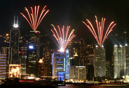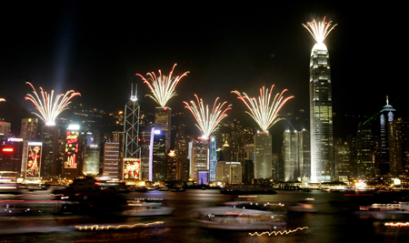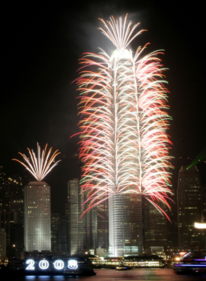 Fireworks light the sky over Victoria Harbour and the city's business district during New Year celebrations in Hong Kong January 1, 2008. [Agencies]