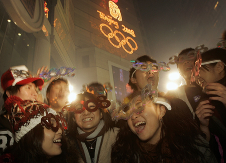 Revellers celebrate at Times Square, which displayed a symbol of the 2008 Olympic Games after the clock struck twelve, in Hong Kong January 1, 2008, to celebrate the countdown to the new year. [Agencies]