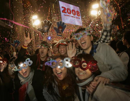 Revellers celebrate at Times Square as they take part in the 2008 New Year countdown in Hong Kong December 31, 2007. [Agencies]