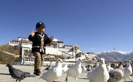 Dainzin, a Tibetean boy, plays with pigeons at the Square in front of the Potala Palace in Lhasa, capital of southwest China's Tibet Autonomous Region, April 7, 2008. Blossom flowers add an odor of spring for the people in and outside the city to enjoy the beautiful scenery. (Xinhua/Purbu Zhaxi)
