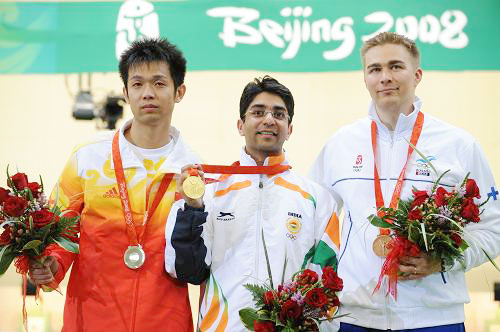 BEIJING, Aug. 11 (Xinhua) -- Indian shooter Abhinav Bindra totaled 700.5 points to win the men's 10-meter air rifle title after a hot chase in the final on Monday, winning India's first gold medal at the Beijing Games, and also its first individual title in Olympic history.