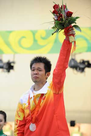 Zhu Qinan of China waves to spectators on podium during awarding ceremony of men's 10m air rifle final of Beijing Olympic Games at Beijing Shooting Range Hall in Beijing, China, Aug. 11, 2008. Zhu took the silver medal of the event with 699.7 points. (Xinhua/Jiao Weiping)