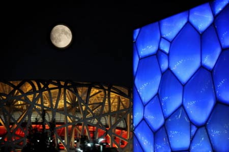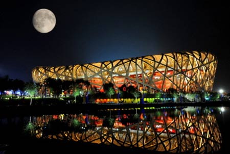 A nearly full moon over the National Stadium or better known as the Bird's Nest in Beijing on early September 14, 2008, which is now hosting the athletic competition for the 2008 Beijing Paralympic Games. Paralympians in Beijing will get a taste of China's Mid-Autumn Festival, which falls on September 14 this year.(Photo Source China Daily/Agencies)