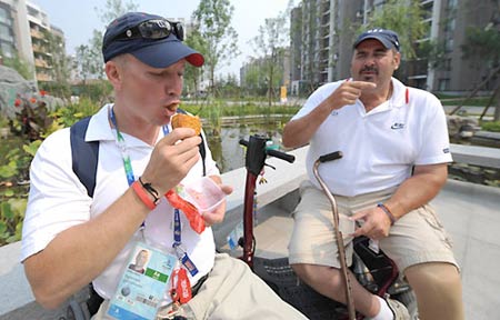 A Paralympian eats a Chinese mooncake in the Paralympic Village, September 14, 2008. (Photo Source: China Daily/Agencies)