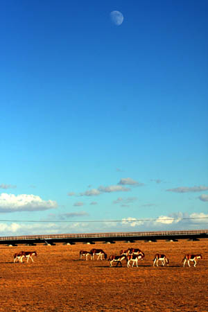 Tibetan wild asses (or kiang) live beside the Qinghai-Tibet railway in Hol Xil, northwest China's Qinghai Province, Oct. 11, 2008. (Xinhua/Ren Xiaogang)