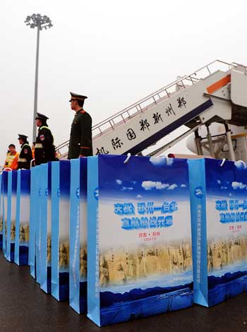 Xinzheng International Airport prepares souvenirs for the passengers taking the maiden direct flight between Henan Province in central China and Taiwan in southeast China, at the airport in Zhengzhou, capital of Henan Province, Feb. 8, 2009. A plane of China's Shenzhen Airlines on Sunday made the maiden direct flight between Henan and Taiwan, carrying more than 130 passengers to Taipei in Taiwan.(Xinhua Photo)