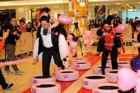 A man carrying his wife rushes to the final during a competition to celebrate the valentine's day, which falls on Feb. 14, at a shopping mall in Hong Kong, south China, Feb. 12, 2009. (Xinhua/Chen Duo)