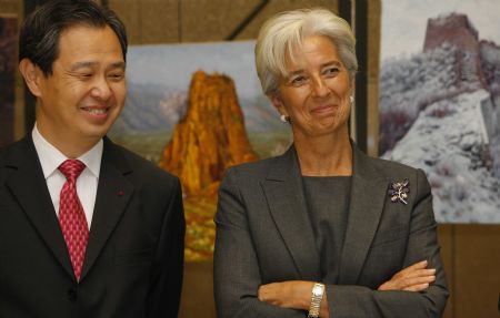 French Finance Minister Christine Lagarde (R) and Chinese ambassador to France Kong Quan attend the opening ceremony of an exhibition of Chinese artist Tian Fengyin's works in Paris, capital of France, on Nov. 3, 2009. The exhibition presents the Great Wall in China and the surrounding scenery in four seasons to French audience on Tuesday.(Xinhua/Zhang Yuwei)