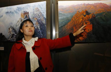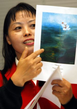 Chinese artist Tian Fengyin introduces her works at the opening ceremony of an exhibition of her works in Paris, capital of France, on Nov. 3, 2009. (Xinhua/Zhang Yuwei)
