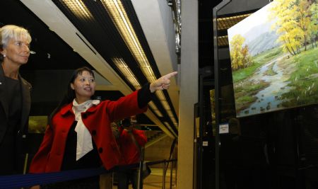 Chinese artist Tian Fengyin (R) introduces her works to French Finance Minister Christine Lagarde at the opening ceremony of an exhibition of Tian's works in Paris, capital of France, on Nov. 3, 2009. (Xinhua/Zhang Yuwei)