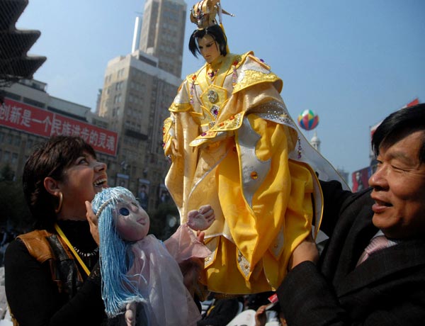 A Chinese artist shows off a traditional hand puppet to a foreigner during the Shanghai International Puppet Festival on Friday, November 6, 2009. Thirty-three troupes from across the world will showcase their puppetry with 24 performances in the five-day-festival that began on Thursday in Shanghai. [Photo:CFP]