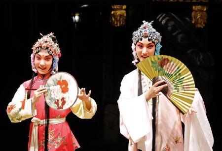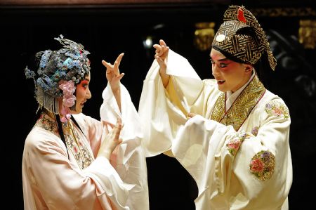 Photo taken on Nov. 7, 2009 shows a scene of "Peony Pavilion", a well-known Chinese traditional Kunqu Opera, at the ancient stage of Sanshan Guildhall in Shanghai, east China. The Kunqu Opera "Peony Pavilion" will be staged during the 2010 Shanghai World Expo for 120 times.(Xinhua/Guo Changyao)