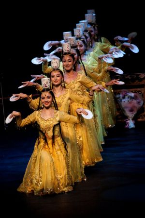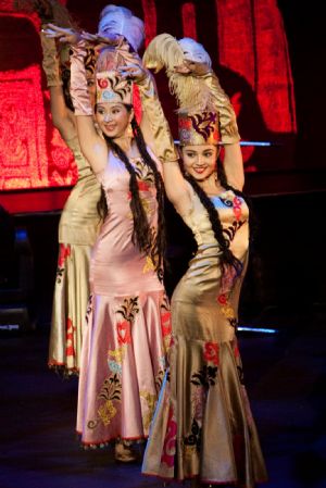 China's Xinjiang troupe performers dance during a singing and dancing performance in Brisbane, Australia, on Dec. 7, 2009. Brisbane serves as the second stop of China's Xinjiang foreign cultural exchange delegation during its visit in Australia.(Xinhua/Chen Mingwei)
