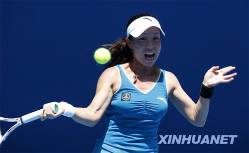 China's Zheng Jie returns to Alona Bondarenko of Ukraine on her way to winning their Women's singles fourth round match at the Australian Open tennis championship in Melbourne, Australia Sunday, Jan. 24, 2010. [Photo: Xinhuanet]