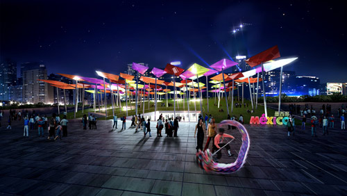 The Mexico Pavilion is not a single building but a 4,000-square-meter area covered in grass with hundreds of kites made of eco-friendly plastic.