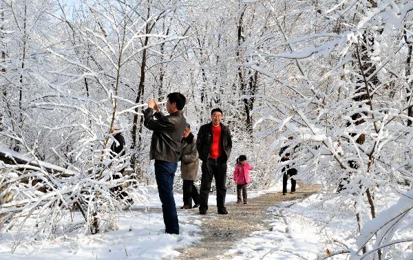 Local residents walk on the path covered by snow in a park of Zhalantun City, north China's Inner Mongolia Autonomous Region, April 27, 2010. Under the impact of cold front from Baikal, the snow started to fall down on Monday and exceeded 20mm thick in Zhalantun.(Xinhua/Wang Zewei)