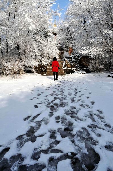 A local resident walks on the path covered by snow in a park of Zhalantun City, north China's Inner Mongolia Autonomous Region, April 27, 2010. Under the impact of cold front from Baikal, the snow started to fall down on Monday and exceeded 20mm thick in Zhalantun. (Xinhua/Wang Zewei)
