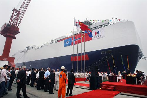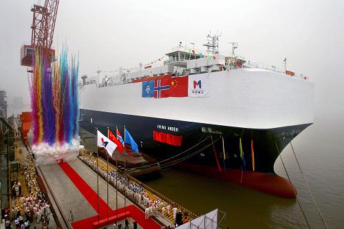 The giant ro-ro vehicle carrier produced by a Chinese private enterprise is officially named 'Viking Amber' during a ceremony held in Nantong, east China's Jiangsu province on Tuesday, June 29, 2010. [Photo:Xinhua/He Jianrong]