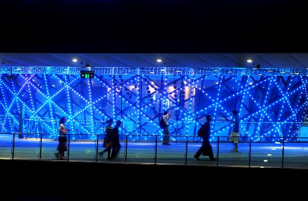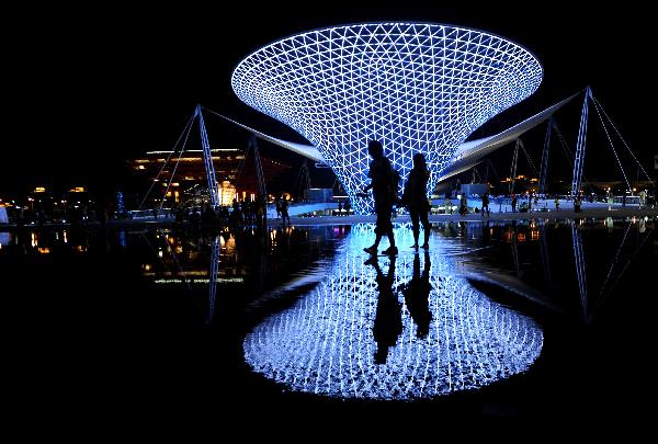 Tourists pass by the Sun Valley at the World Expo Park in Shanghai, east China, on the night of July 2, 2010. More and more people prefer the night hiking in the World Expo Park to the daytime in order to avoid heat and crowded visitors. (Xinhua/Yan Yan)