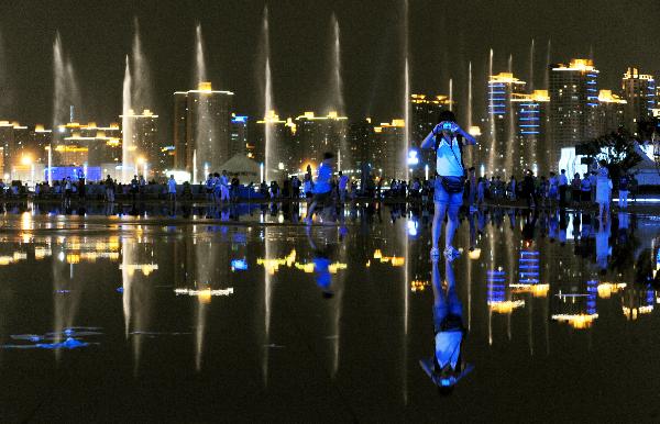 Tourists visit the World Expo Park in Shanghai, east China, on the night of July 2, 2010. More and more people prefer the night hiking in the World Expo Park to the daytime in order to avoid heat and crowded visitors. (Xinhua/Yan Yan)