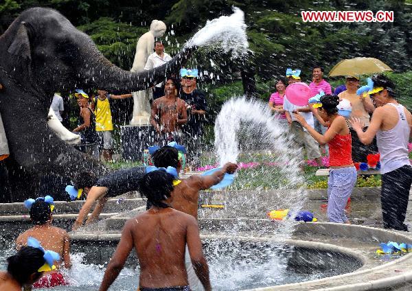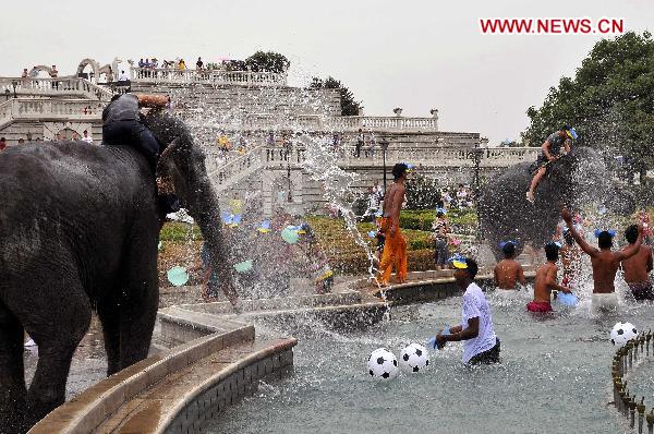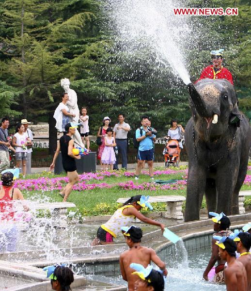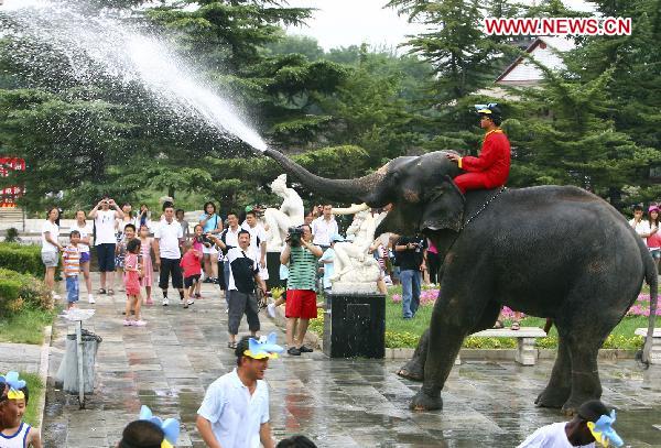 An elephant enjoys water splashing with tourists and staff members at the World Park in Beijing, capital of China, July 7, 2010. (Xinhua/Ru Tao)