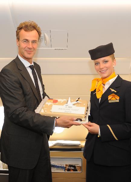 Staff members present a cake onboard a Lufthansa's Airbus A380 as it arrives at Beijing Capital International Airport for the first time in Beijing, capital of China, Sept. 2, 2010. The airplane, Lufthansa's third Airbus A380, will fly from Frankfurt to Beijing regularly. (Xinhua/Ma Ruzhuang)