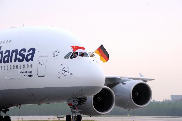 Lufthansa's Airbus A380 arrives at Beijing Capital International Airport for the first time in Beijing, capital of China, Sept. 2, 2010. The airplane, Lufthansa's third Airbus A380, will fly from Frankfurt to Beijing regularly. (Xinhua/Ma Ruzhuang)