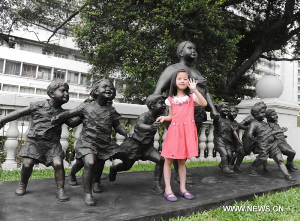A girl poses with a sculpture named Morning Glory designed by Chinese contemporary sculptor Xu Hongfei during a preview of the Hong Kong International Art and Antiques Fair (Fine Art Asia 2010) in Hong Kong, south China, Sept. 2, 2010. The sculpture estimated value is 1.6 million HK dollars. The annual Hong Kong International Art and Antiques Fair will be held in Hong Kong Convention and Exhibition Center from Oct. 3 to 6, featuring Asian antiques and contemporary artworks. (Xinhua/Li Qiuchan)