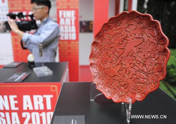 The photo taken on Sept. 2, 2010 shows the Yuan Dynasty Cinnabar Lacquer Circular Foliate Dish Carved with Birds and Flowers at an estimated value of 2.5 million HK dollors during a preview of the Hong Kong International Art and Antiques Fair (Fine Art Asia 2010) in Hong Kong, south China. The annual Hong Kong International Art and Antiques Fair will be held in Hong Kong Convention and Exhibition Center from Oct. 3 to 6, featuring Asian antiques and contemporary artworks. (Xinhua/Li Qiuchan)