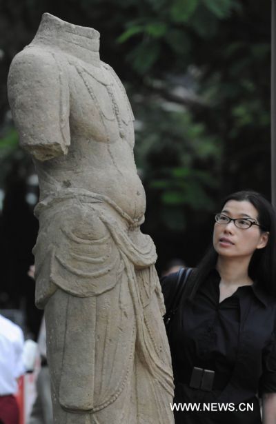 A staff member introduces a Tang Dynasty Sandstone Bodhisattva body with an estimated value of 9 million HK dollors during a preview of the Hong Kong International Art and Antiques Fair (Fine Art Asia 2010) in Hong Kong, south China, Sept. 2, 2010. The annual Hong Kong International Art and Antiques Fair will be held in Hong Kong Convention and Exhibition Center from Oct. 3 to 6, featuring Asian antiques and contemporary artworks. (Xinhua/Li Qiuchan)