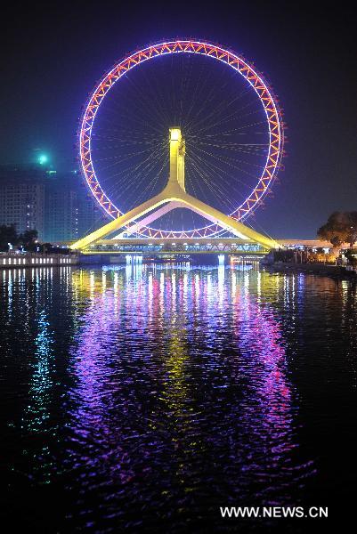 Photo taken on Aug. 31, 2010 shows the "Eye of Tianjin" landscape light above Haihe River in north China's Tianjin. To celebrate the coming Summer Davos Forum, Tianjin accomplished 35 sets of landscape lights to embrace guests from home and abroad. (Xinhua/Liu Haifeng)