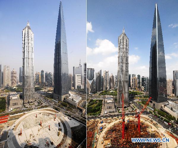 Combo Photo shows the site of Shanghai Tower before construction on Nov. 27, 2008 (L), and under construction on Sept. 20, 2010 (R), in Shanghai, east China. The ground for the highest building in design in Chinese mainland, the 632-meter high, 128-storey skycraper dubbed Shanghai Tower was broken recently. The building will be completed and put into use in 2014. (Xinhua)