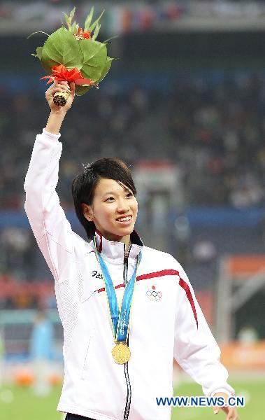 Japan's Fukushima Chisato raises a bouquet during the awarding ceremony of the women's 200m final of athletics at the 16th Asian Games in Guangzhou, south China's Guangdong Province, Nov. 25, 2010. Fukushima Chisato won the gold medal in a time of 23.62 seconds. (Xinhua/Liao Yujie)