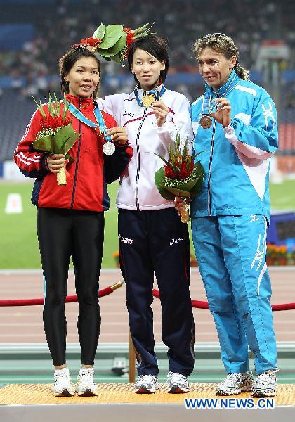 Japan's Fukushima Chisato (C), Vietnam's Vu Thi Huong (L) and Uzbekistan's Guzel Khubbieva show their medals on the podium during the awarding ceremony of the women's 200m final of athletics at the 16th Asian Games in Guangzhou, south China's Guangdong Province, Nov. 25, 2010. Fukushima Chisato won the gold medal in a time of 23.62 seconds, Vu Thi Huong and Guzel Khubbieva got silver and bronze respectively. (Xinhua/Liao Yujie)