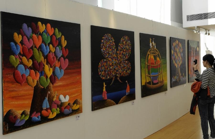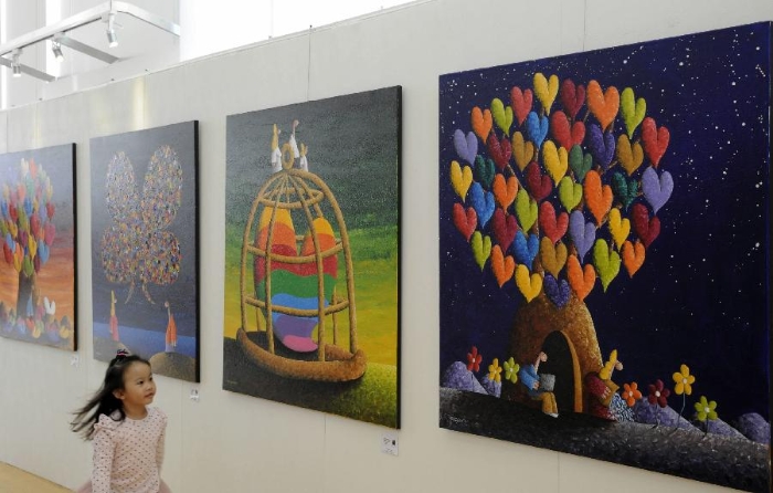 A girl looks at the paintings of Turkish artist Coplu in Hong Kong, south China, Dec. 29, 2011. The art exhibition "Colours of Love" by Turkish artist Coplu was held in Hong Kong Thursday. The artist expresses his hope and dream for humankind and a bright future through his works. (Xinhua/Song Zhenping)