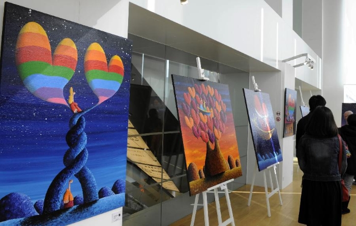 People look at the paintings of Turkish artist Coplu in Hong Kong, south China, Dec. 29, 2011. The art exhibition "Colours of Love" by Turkish artist Coplu was held in Hong Kong Thursday. The artist expresses his hope and dream for humankind and a bright future through his works. (Xinhua/Song Zhenping)