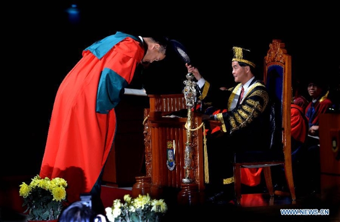 Former NBA star Yao Ming is conferred a Doctor Degree of Social Sciences honoris causa by Hong Kong Chief Executive Leung Chun-ying (R) during the 187th Congregation of the University of Hong Kong, China, on Nov. 27, 2012. Yao Ming receives a Doctor Degree of Social Sciences honoris causa at the University of Hong Kong on Tuesday. (Xinhua/Chen Xiaowei)