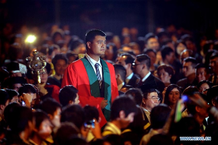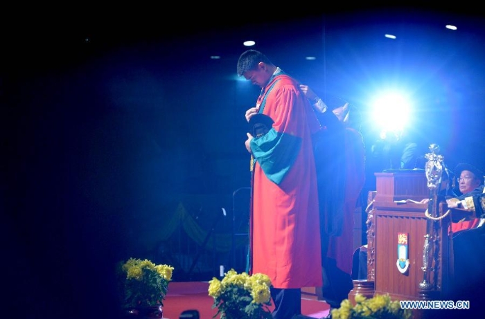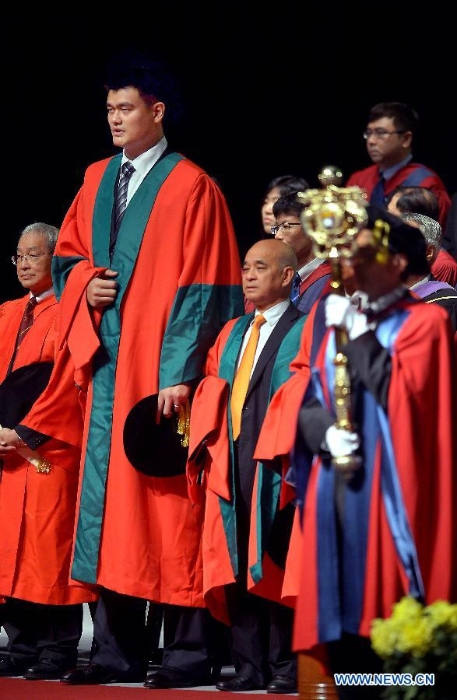 Former NBA star Yao Ming is seen during the 187th Congregation of the University of Hong Kong, China, on Nov. 27, 2012. Yao Ming receives a Doctor Degree of Social Sciences honoris causa at the University of Hong Kong on Tuesday. (Xinhua/Chen Xiaowei)